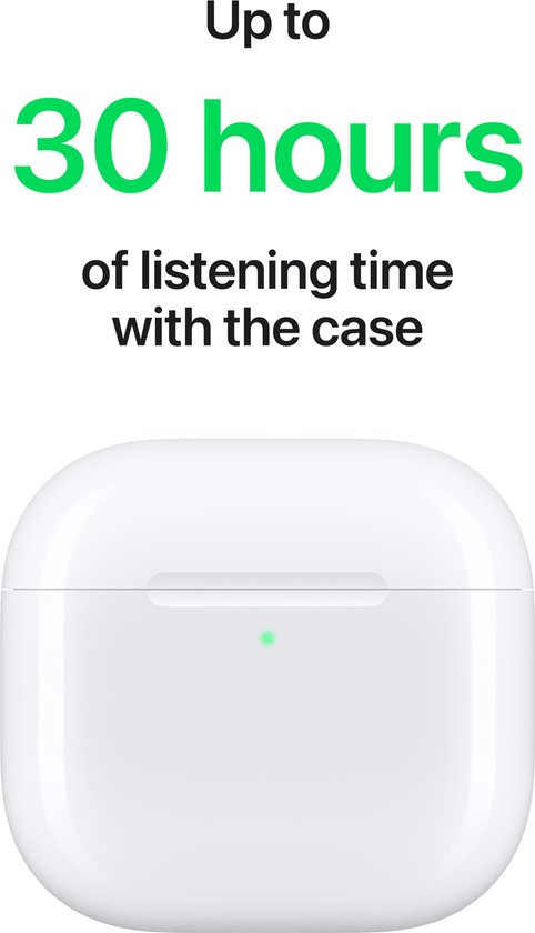 Op een volle lading bieden de AirPods 4 tot wel 5 uur luisterplezier, en in combinatie met de meegeleverde oplaadcase geniet je van meer dan 30 uur totale batterijduur. Bovendien ondersteunt de case USB-C opladen, wat een snellere en efficiëntere laadsessie mogelijk maakt.