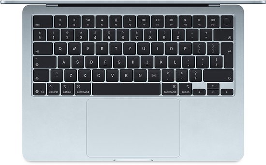 De MacBook Air is slechts 1,1 cm dun en weegt minder dan 1,3 kg, waardoor hij ideaal is voor onderweg. De stevige gerecyclede aluminium behuizing draagt bij aan duurzaamheid, en in de nieuwe kleur Hemelsblauw ziet hij er ook nog eens prachtig uit.