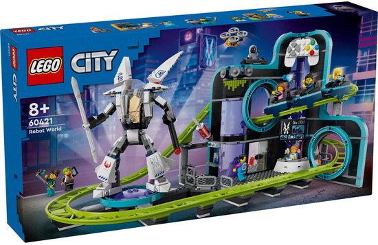 Kinderen die dol zijn op gamen en pretparken zullen weg zijn van deze echt werkende achtbaanset. Het LEGO® City Achtbaan in Robotwereld (60421) avonturenspeelgoed zit boordevol details voor urenlang fantasierijk speelplezier. Kinderen kunnen de trein met 3 karretjes door een futuristische videogameattractie laten suizen met een speelhal met videogameconsoles, een e-sportarena, een slushiebar en meer. De set bevat ook een verstelbaar mechapak en 8 minifiguren voor rollenspellen en verhalen.Deze creatieve bouwset is inclusief stapsgewijze gedrukte bouwinstructies en 3D-instructies in de LEGO Builder app – een digitale bouwpartner met intuïtieve zoom- en draaifuncties waarmee kinderen modellen van alle kanten kunnen bekijken tijdens het bouwen.LEGO City speelgoed bevat coole voertuigen, realistische gebouwen en leuke personages. Kinderen kunnen deze LEGO City set combineren met andere sets (apart verkrijgbaar) uit het LEGO City assortiment voor nog meer speelmogelijkheden.