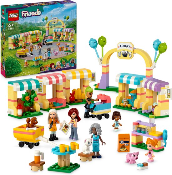 Accessoires zijn een borstel, appel, pen, voerbak, paddenstoel, mokken, adoptiepapieren en voedsel voor de dieren. Ontdek meer bouwspeelgoed voor kinderen in het LEGO Friends universum, waar veel mogelijkheden zijn om verhalen uit het echte leven na te spelen.