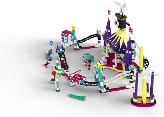Dit 974-delige model vormt een inspirerend bouwproject en biedt vele creatieve speelmogelijkheden. In het midden staat een grote stoffen tent voor de goochelshow. Jonge goochelaars kunnen met behulp van een doos met een slimme functie de LEGO Friends minipoppetjes laten verdwijnen! Ze kunnen ook doen alsof ze een vuurspuwende jongleur zijn. De set bevat een speelgoedachtbaan, compleet met schattige konijnenkarretjes en een plek waar actiefoto's worden gemaakt, en een slingerattractie voor kinderen zonder hoogtevrees. En in het donker zien kinderen de coole glow-in-the-dark stenen!