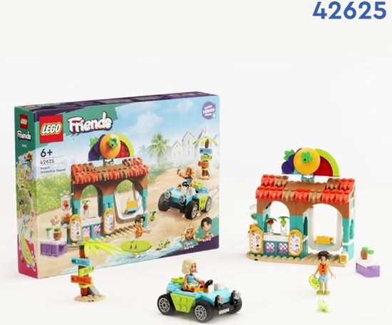 Stimuleer kinderen om creatief aan de slag te gaan met deze LEGO® Friends Strand smoothiekraam (42625) speelset met etenswaren voor meisjes en jongens vanaf 6 jaar. De set bevat een bouwbare smoothiekraam en strandbuggy, plus LEGO Friends Nova en Niko minipoppetjes.Kinderen kunnen veel verschillende smoothies creëren door ingrediënten te combineren en ze vervolgens in de blender te mixen. Ze kunnen het verhaal naspelen waarin Nova en Niko ontspannen met een drankje op de schommel voordat ze op avontuur gaan in de strandbuggy. Deze LEGO bouwset bevat diverse accessoires voor fantasierijk speelplezier, waaronder een menubord, surfplank, zwemvest, dashboardcamera en wegwijzer.Ontdek meer fantasiespeelgoed (apart verkrijgbaar) in het LEGO Friends universum, waar nog veel meer vriendschapsverhalen te vinden zijn. Deze set kan worden gebouwd met behulp van de intuïtieve LEGO Builder app. Hiermee kunnen kinderen inzoomen en modellen in 3D draaien, sets opslaan en hun voortgang bijhouden.