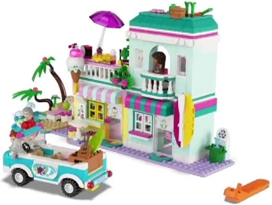 Het gebouw van 2 verdiepingen bevat een ijssalon met dakterras, een winkel waar je strandspullen kunt huren en het appartement plus groentetuin van de oma van LEGO Friends Mia. Er is ook een coole cabrio waarmee Andrea en Mia hun surfplanken naar het strand kunnen vervoeren. Op het strand kunnen ze surfen en met de dolfijn en schildpad spelen. Natuurlijk zit ook deze LEGO Friends set vol accessoires voor allerlei creatieve verhalen. Een gitaar, platenspeler en zonnebrandcrème geven een echt vakantiegevoel.