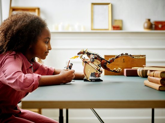 Lees volledige pagina →Met de LEGO Harry Potter Hongaarse Hoornstaart draak (76406) kunnen fans van de magische films één van de gevaarlijkste draken die ooit heeft bestaan in de Tovenaarswereld bouwen, neerzetten en laten 'vliegen'. Jongens en meisjes vanaf 10 jaar zullen zeker enthousiast worden van dit leuke constructie speelgoed. Met dit LEGO Harry Potter model bouwen kinderen de zwarte schubben, puntige staart en vurige adem van de Hongaarse Hoornstaart draak na. Na de boeiende bouwervaring kunnen ze dit leuke interieur accessoire op een mooi plekje neerzetten. Dankzij een hendel aan de achterkant kunnen ze de scharnierende vleugels van het dier op sierlijke wijze op en neer laten gaan. De indrukwekkende figuur met enorme vleugels staat op een stevige standaard en wordt bijgestaan door een minifiguur van Harry Potter op zijn bezemsteel. Met LEGO Harry Potter sets vol populaire personages, bekende locaties en geheimzinnige functies beleven kinderen betoverende avonturen. Dankzij de eenvoudige stapsgewijze instructies bij de speelsets kunnen ze ook zonder toverkracht aan de slag. Voor een beetje extra magie kunnen ze de gratis LEGO Bouwinstructies app gebruiken, waarmee ze het model tijdens het bouwen kunnen draaien en erop kunnen inzoomen. Dit leuke verzamelitem is een geweldig cadeau voor tovenaars, dreuzels en echte Harry Potter-fans. De draak heeft een spanwijdte van ca. 40 cm en een maximum lengte van ca. 48 cm Bevat 671 onderdelen