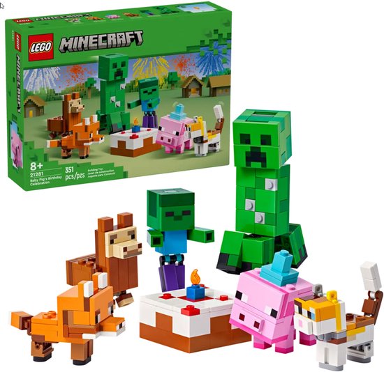 Dit cadeau met feestthema zit boordevol LEGO Minecraft modellen en mobs. Er is een Creeper™ figuur met beweegbare benen en hoofd en een opbergvak met buskruit boven op zijn hoofd (in de vorm van een klein, grijs element); een babyzombie met beweegbaar hoofd, armen en benen; een jonge vos met beweegbare kop, poten en staart; een kitten met beweegbare kop, poten en staart; een jonge lama met beweegbare poten; een biggetje met beweegbare kop en eencake die in 3 stukken kan worden verdeeld. Voor nog meer creatief plezier kunnen kinderen met de LEGO Builder app inzoomen en hun modellen in 3D draaien op hun digitale apparaat.