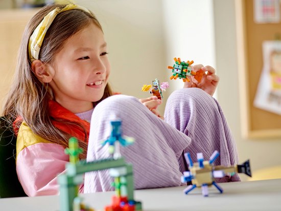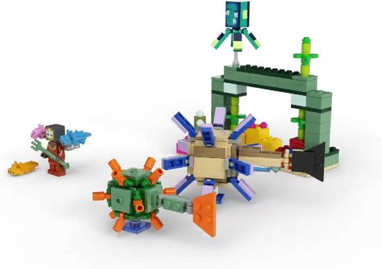 Kinderen beleven een avontuur boordevol actie met deze spannende Minecraft missie onder de zeespiegel. Eerst moeten ze een monument bouwen tussen het kleurrijke koraalrif. Er zit een schat in verborgen, maar er liggen ook 2 bekende Minecraft mobs op de loer: een bewaker en een oude bewaker, die vastberaden zijn hen te stoppen. Met een drietand en 3 behulpzame axolotls moeten kinderen de vijandige mobs zien af te weren voordat ze verder kunnen met hun missie. Als de grotere bewaker met zijn staart klapt, wordt er een laserprojectiel gelanceerd via een veermechanisme. Dit avontuur van LEGO stenen biedt kinderen eindeloze spannende speelmogelijkheden die zijn gebaseerd op de Minecraft game.