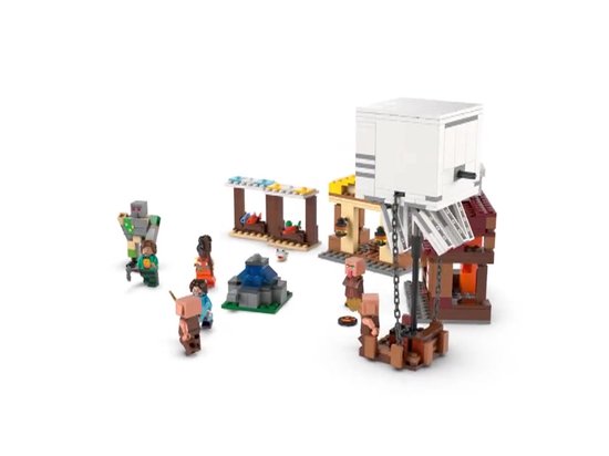 De set bevat populaire Minecraft personages uit de videogame: Steve, Natalie, Dawn, 2 piglins, een Ghast-ballon, een dorpeling, een speelgoed kuiken dieren figuur en een verstelbare Minecraft figuur van een ijzergolem. De ballon heeft ruimte voor de piglins en is voorzien van een schijfschieter. In het dorp staan marktkraampjes, Steve's gefrituurde kiprestaurant, zijn craftinghut en een fontein, die kinderen kunnen laten 'ontploffen' met behulp van een ingebouwde functie. Op het dak van het restaurant staat een groot kippenmodel met een leuke eierlegfunctie. Voor digitaal plezier kunnen kinderen de LEGO Builder app gebruiken om in te zoomen, modellen in 3D te draaien en hun voortgang bij te houden. Deze LEGO set geweldig Minecraft cadeau voor jongens en meisjes vanaf 10 jaar en vormt na het bouwen mooie kinderkamer decoratie.