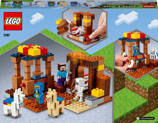 Lees volledige pagina →LEGO® Minecraft™ De handelspost (21167) zit boordevol populaire Minecraft elementen voor eindeloze fantasierijke rollenspellen: een ontploffende mijn, een vijandig skelet, een mysterieuze handelaar en 2 lama's! Het is een drukte van jewelste rondom de Minecraft™ mijn. Steve is hard aan het werk om kostbare grondstoffen te delven voordat hij naar de handelspost trekt. Maar niet alles verloopt volgens plan. De lama's zijn losgebroken, er klinkt een ontploffing, een vijandig skelet valt aan en de handelaar heeft niets om te verhandelen! Of lijkt dat maar zo? Draai aan de hendel om erachter te komen.