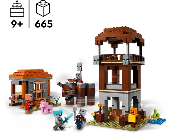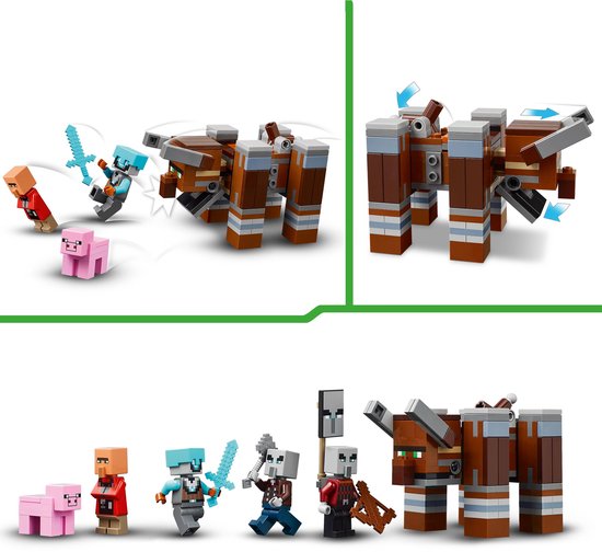 Dit Minecraft game speelgoed voor kinderen van 9 jaar en ouder bevat 4 LEGO Minecraft minifiguren: een Ruimtewachter, Verschoppeling, dorpeling en Verdediger. De bouwbare Verwoester heeft een hendel waarmee kinderen zijn kaak kunnen laten klappen en met zijn kop kunnen rammen. Er is een uitkijktoren van 3 verdiepingen met ladders, banieren met Plunderaars en een kist met kostbare buit. Het LEGO Minecraft huis van de metselaar heeft een deur die open kan en een gemeubileerd interieur met een bed en een steenzaag. Inclusief een LEGO Minecraft varken en accessoires voor rollenspellen: een trainingspop, fakkel, wortel, ijzerstaaf, diamanten helm, diamanten zwaard, kruisboog en ijzeren bijl.