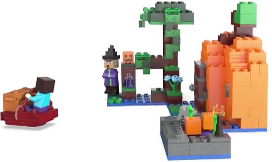 Als een heks drankjes naar Steve gooit en hij zich verdedigt met zijn boog. De set bevat ook kikker dieren figuren, een speelgoed boot en een kist met een ei en suiker, waarmee kinderen pompoentaart kunnen bakken! Voor extra digitaal plezier kunnen bouwers inzoomen, sets in 3D draaien en hun voortgang bijhouden met de leuke LEGO Builder app. Dit Minecraft speelgoed huis is een tof cadeau voor kinderen, jongens en meisjes.