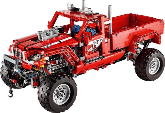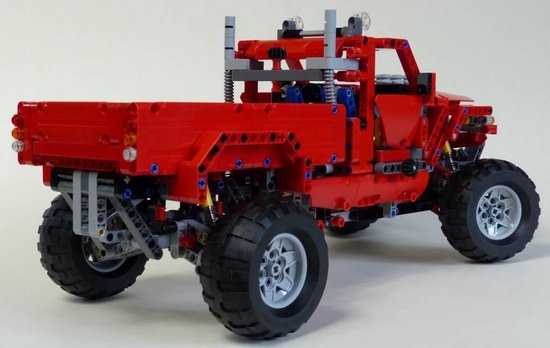 Vervoer zware ladingen door ruig terrein met deze enorme rode Pick-up truck! Een stoer voertuig met enorme wielen, robuust chassis, volledig onafhankelijke wielophanging, grote V-6 motor, stevige bumper, lier en kiepbare laadbak.