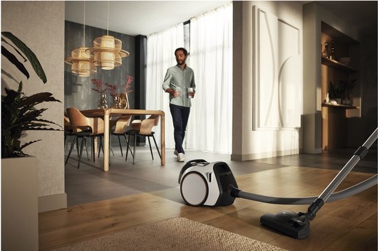 Met vier vermogensstanden stem je de zuigkracht af op de ondergrond en de vervuiling. Dat is handig bij het reinigen van harde vloeren, tapijt, bekleding of de auto. De actieradius van 10 meter geeft je veel bewegingsvrijheid, terwijl het draaghandvat extra comfort biedt bij het verplaatsen van de stofzuiger. Het AirClean filtersysteem helpt daarnaast om uitgeblazen lucht schoner te houden tijdens het stofzuigen.