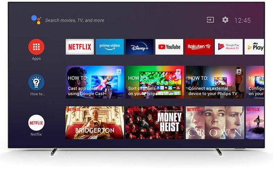 Het Android TV-platform biedt toegang tot de Google Play Store met duizenden apps en games. Netflix, Disney+, YouTube, Amazon Prime Video en vele andere diensten zijn direct beschikbaar. De ingebouwde Google Assistant maakt spraakbesturing mogelijk. Chromecast is ingebouwd voor het streamen vanaf je smartphone of tablet.