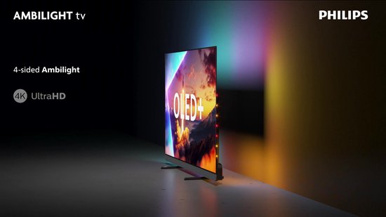 Vierzijdige Ambilight maakt het kijken unieker en comfortabeler door de muur achter de televisie te verlichten in kleuren die overeenkomen met wat je op het scherm ziet. Dit vergroot de immersie en vermindert de belasting van je ogen. Je kunt kiezen uit verschillende modi: van sfeervolle muurkleur-aanpassing tot dynamische lichtpatronen die reageren op muziek, en zelfs een rustgevende AmbiSleep-modus voor 's nachts.