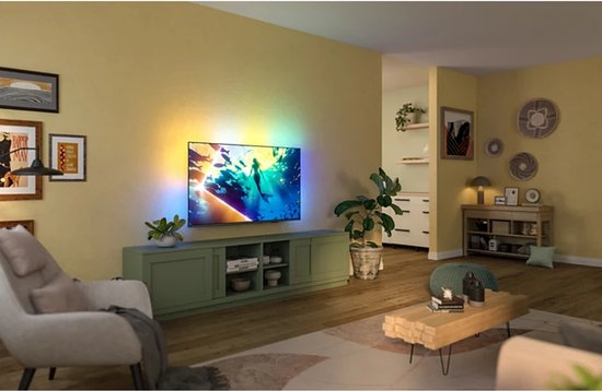 Slim geplaatste LED-lampjes aan de achterkant projecteren kleuren op de muur die meebewegen met wat er op het scherm gebeurt. Dat zorgt niet alleen voor extra sfeer, maar ook voor een rustiger kijkervaring doordat het contrast tussen scherm en omgeving kleiner wordt.