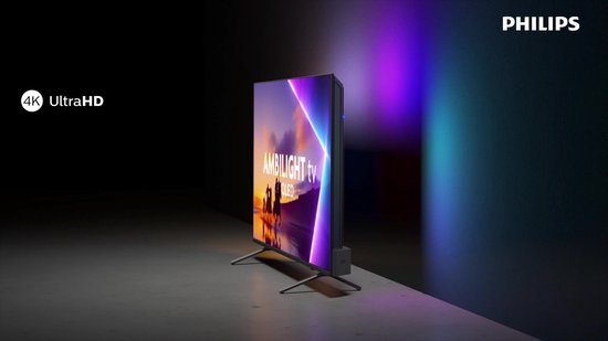 De geïntegreerde LED-verlichting achter het scherm reageert op alles wat je bekijkt en omhult je in een kleurrijke lichtkrans. Films, sport, muziekvideo's en games worden intenser en meeslepender. Ambilight maakt het scherm visueel groter en creëert een sfeervolle beleving. In lounge-modus vult Ambilight je kamer met zachte kleuren wanneer de TV inactief is.