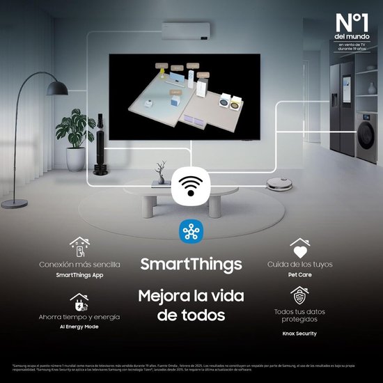 De TV beschikt over HDMI 2.1-ingangen met ARC en eARC-ondersteuning, USB 2.0-poorten, Ethernet LAN en een CI+ slot. Ingebouwde Wi-Fi en Bluetooth 5.3 zorgen voor draadloze verbindingen met je netwerk en accessoires. Met Anynet+ bedien je aangesloten Samsung-apparaten met een enkele afstandsbediening.